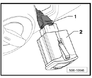 - Release and separate connector -1- and remove the headlight range control thumb wheel - E102- -2-.