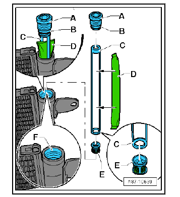 - Lift the dryer mount -C- with the dryer cartridge -D- out of the condenser.