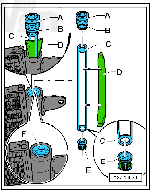 - Screw the rubber bushing of the radiator on to the lock carrier, after you have cut the fasteners -arrows- on the rubber bushing. Screws.