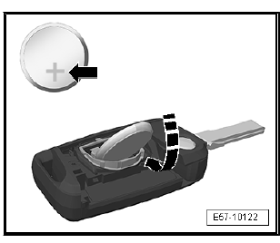 - Insert the battery in the direction of the -arrow- into its mount making sure that the positive pole is visible (pointing upwards).