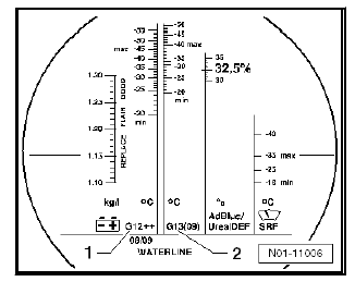 Read the frost protection value on the scale of the respective refilled coolant additive The temperature read off the refractometer - T10007A- equates to the "ice flocculation point". Ice flocculation can start forming in the coolant below this temperature.