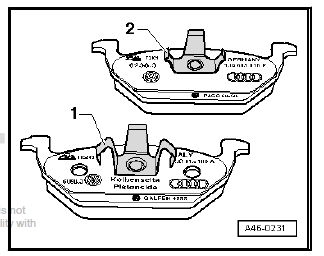 - Insert inner brake pad (piston side) -1- and outer brake pad -2- into brake calliper with retaining springs.