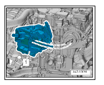 - Turn the drive lug of vacuum pump -1- so it engages in the slot in the camshaft when the vacuum pump is installed -arrows-.
