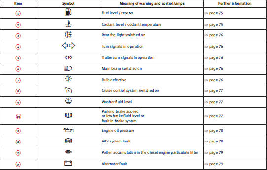 Fig. 46 Instrument panel with warning lamps. Some of the items of equipment listed here are fitted only on certain models/model years or are optional extras.